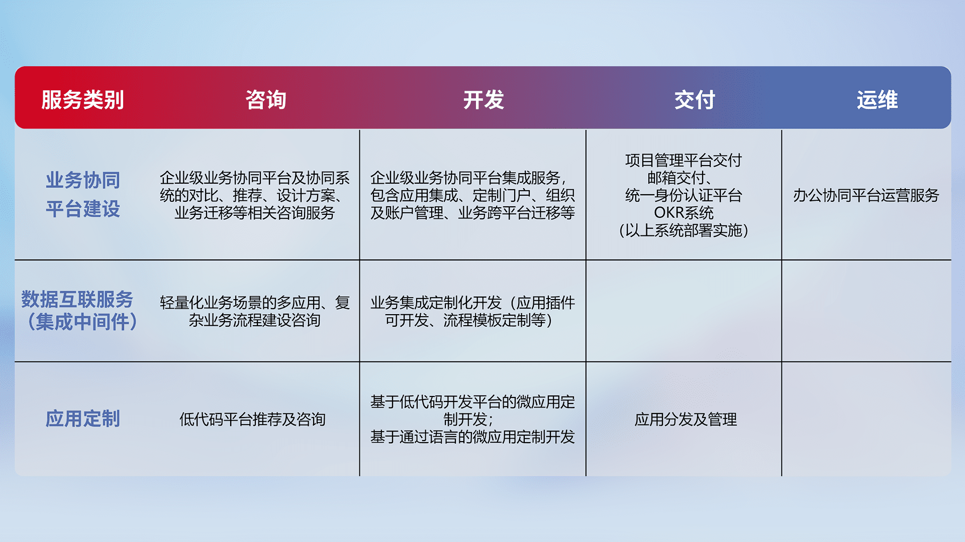 针对钉钉、、、、企微、、、、IDaas等平台级产品提供产品的规划、、方案、、、、交付、、、、定制化开发等服务,,,,实现如统一协同办公、、智能客户服务、、混合会议管理、、智能数据查询、、、、等业务场景,,,,实现数字化转型。。。