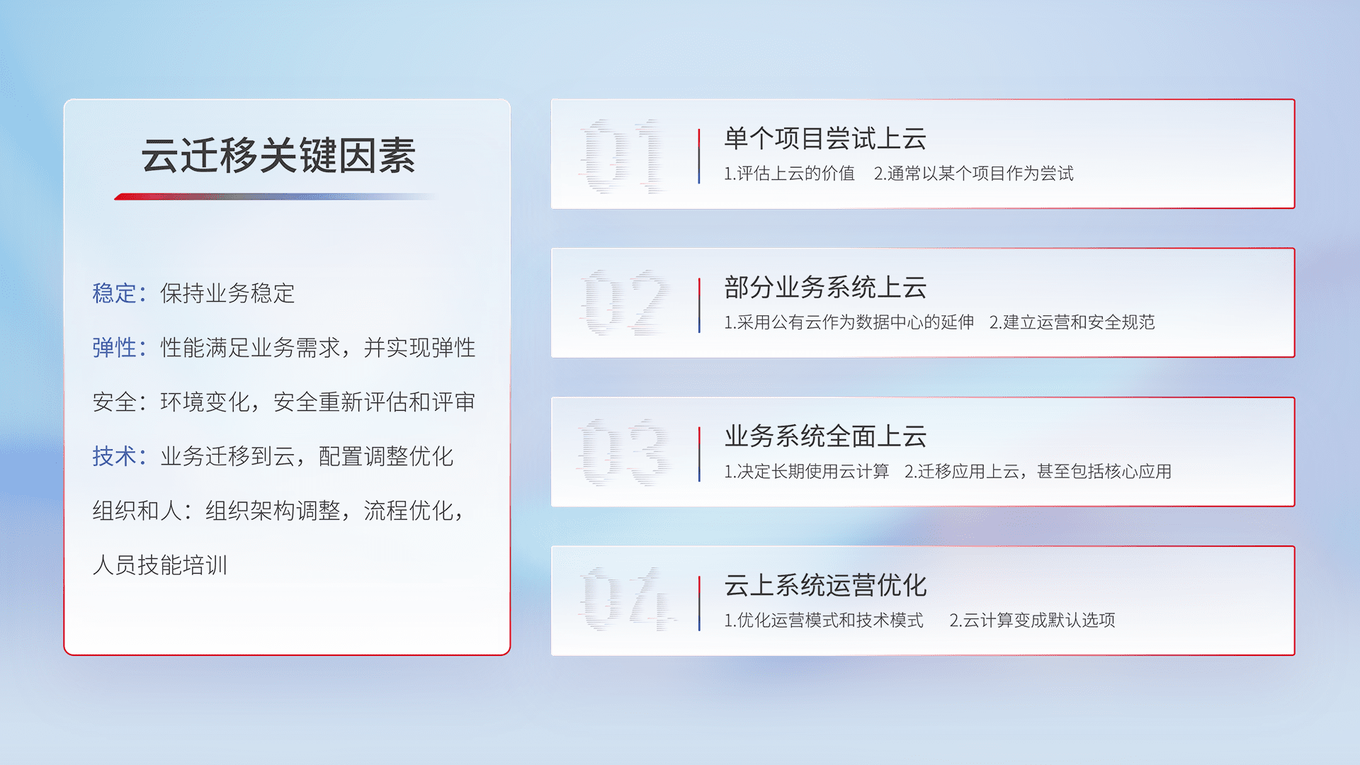 结合实际业务,,从规划设计、、、、云平台选型、、、云原生改造、、、、数据迁移、、、集成交付,,,迁移全过程为客户识别最佳上云路径,,做好风险识别管理,,设计网络架构、、身份权限、、、安全审计合规、、、操作审计、、、日志审计、、监控告警策略、、、多站点容灾设计等,,,对云上基础设施进行整体规划,,,提升IT治理水平,,以满足弹性、、、、高可用、、、、高性能的需求。。