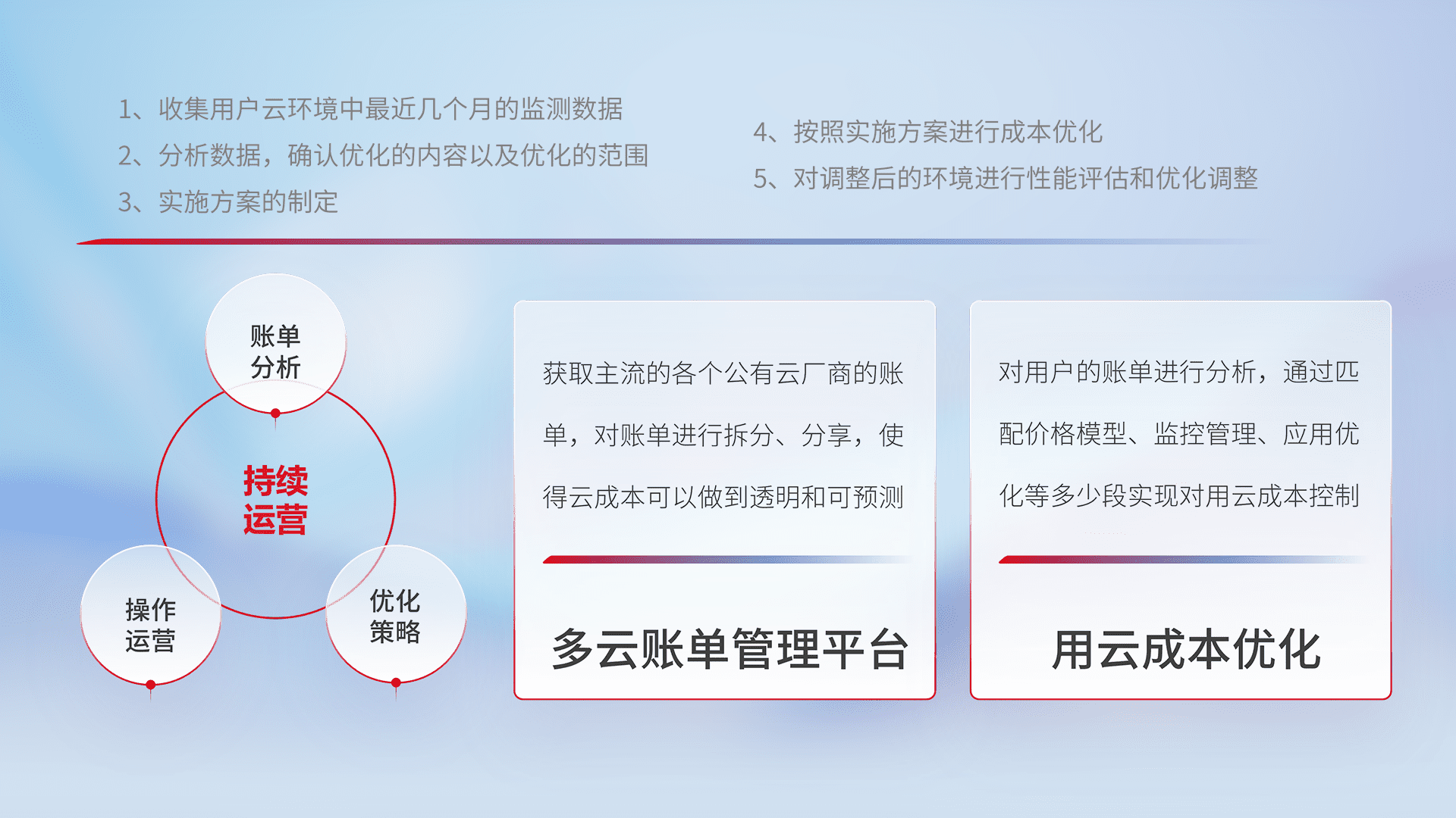 通过多云纳管,,以统一的资源数据模型把客户的云资源进行抽象和封装,,,,进而实现对多云资源的统一操作,,,,保障云资源管理的可靠性、、稳定性与可用性。。。。量身定制化运维内容,,,,配置、、、开发运维、、、、补丁管理、、、备份、、监控、、、认证和访问管理、、审计和日常巡检等,,,保障在用云过程中的可靠度,,,稳定度以及高可用率。。。。